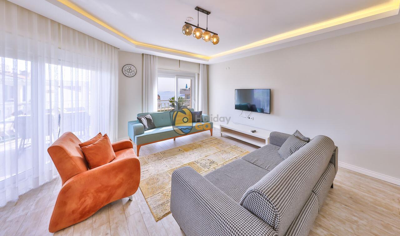 Apartımız,Bahçe ve Deniz manzaralı şık bir salona sahip olup salonumuzda;2 Adet 3’lü Koltuk,1 Adet Berjer ve TV bulunmaktadır.Kitchen