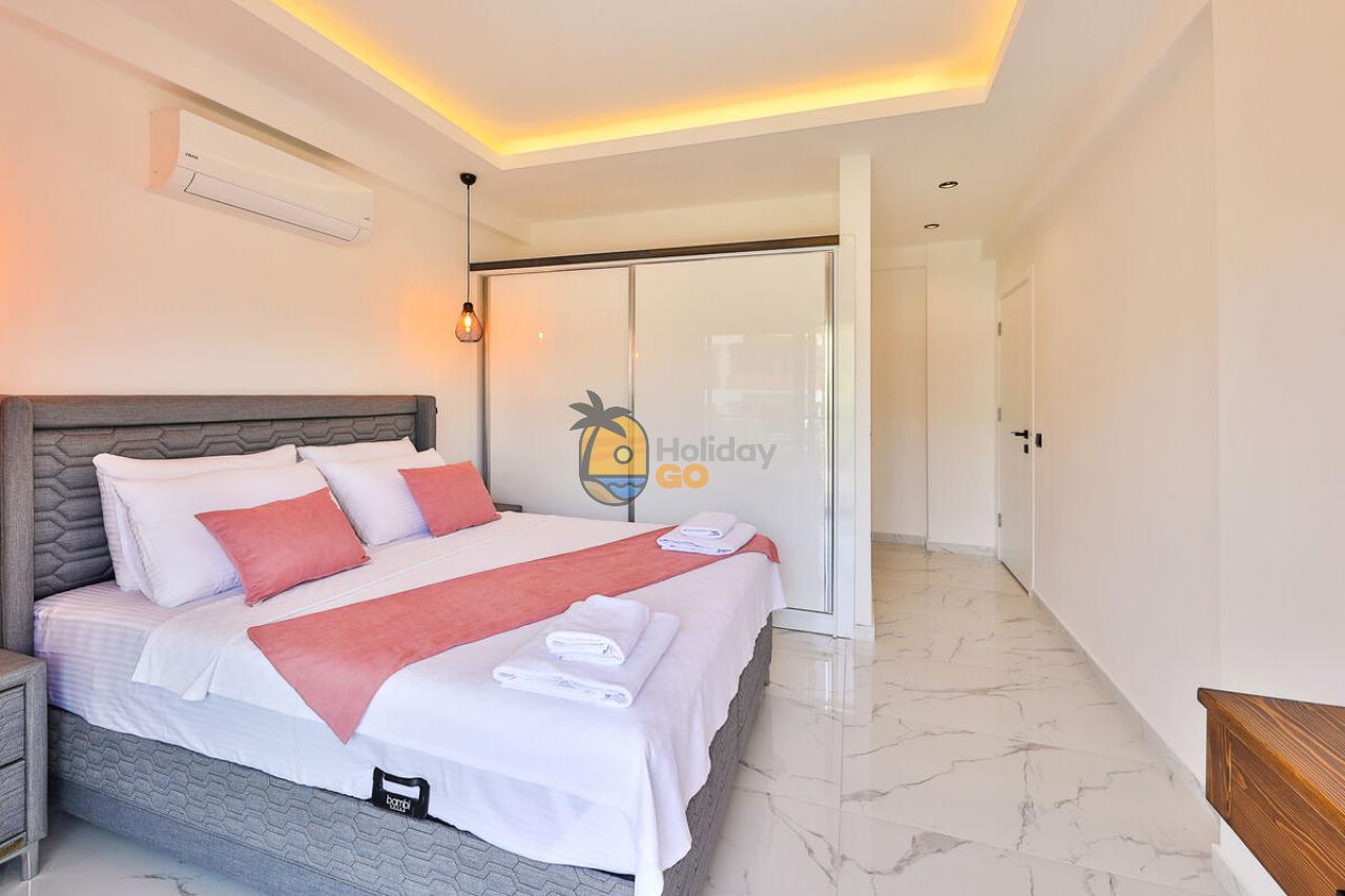 1. Yatak Odası : 1 adet çift kişilik yatak, klima, komodin, makyaj aynası ve banyo bulunmaktadır.